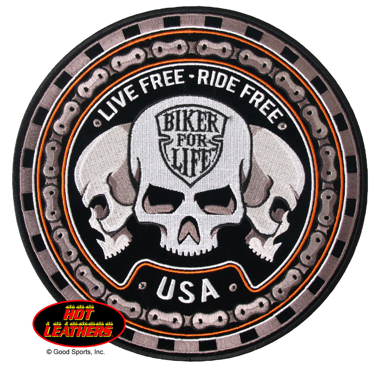 Motorkářská nášivka Hot Leathers. Nášivky v tom nejlepším provedení. Krásně vyšívané, skvěle barevné a propracované, výborné motivy. Různé velikosti. Dovoz USA. Velikost (průměr) 22,5 cm.Vyber variantu